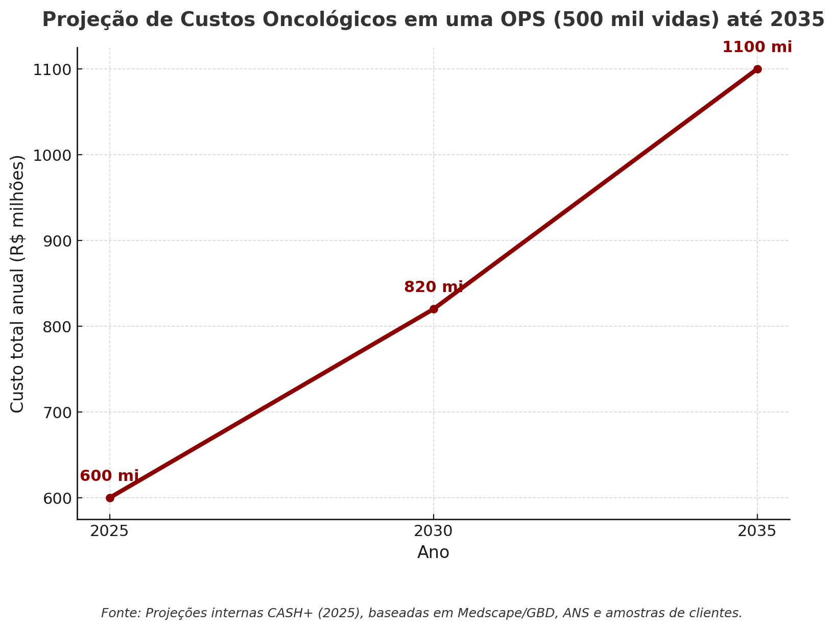 Cada ano que passa, as carteiras ficam mais antigas, mais complexas e mais caras. Uma operadora que gastava R$ 600 milhões em 2025 com oncologia, poderá ver essa cifra ultrapassar R$ 1,1 bilhão em 2035 (Projeções CASH+ com base em ANS e clientes).